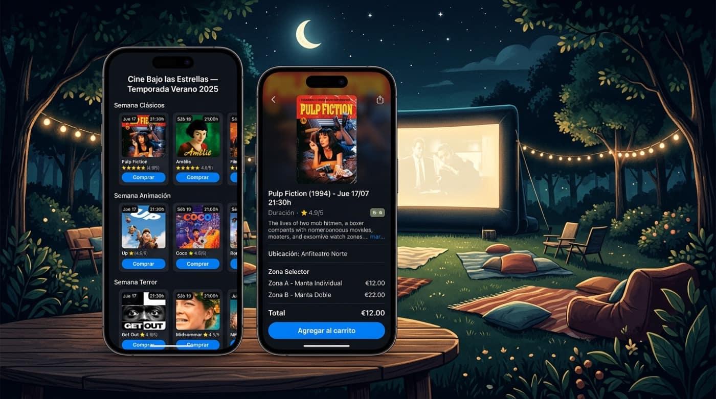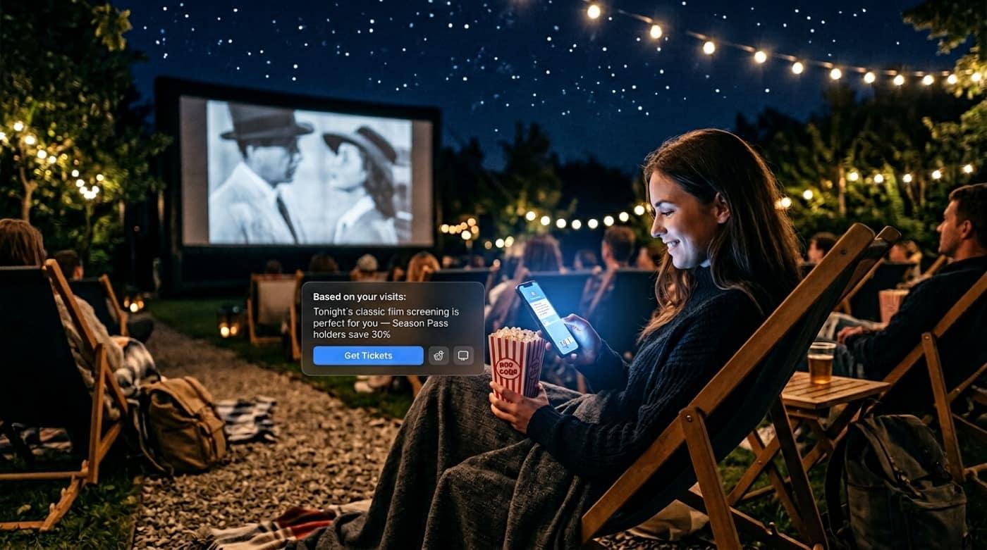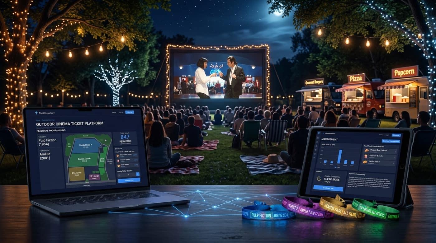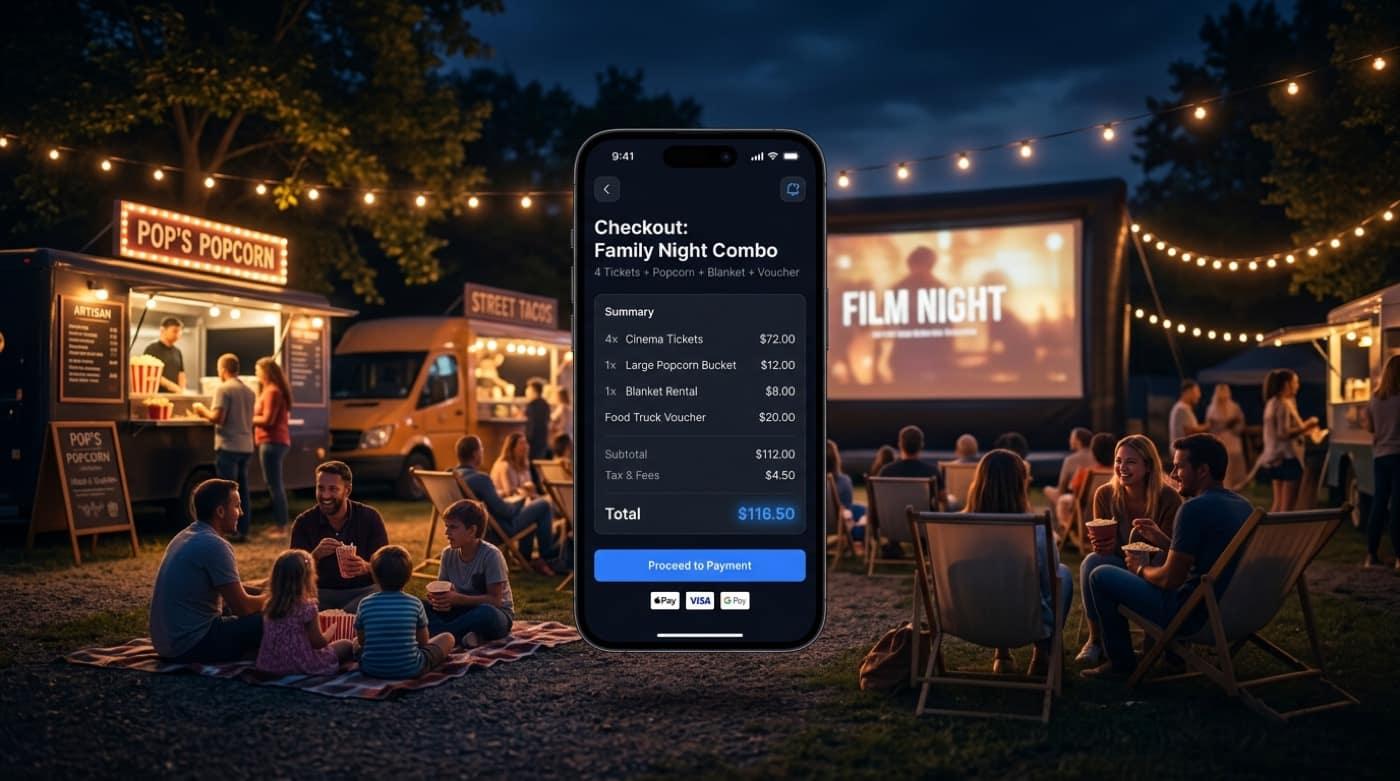 Pop-up nights, summer seasons, and family zones in a mobile-first storefront. Caps per screen, food trucks in the cart, and remarketing between titles — with full operational control.