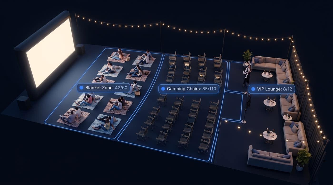 Blanket, chair, and VIP lounge with independent capacity. Sales stop when full.