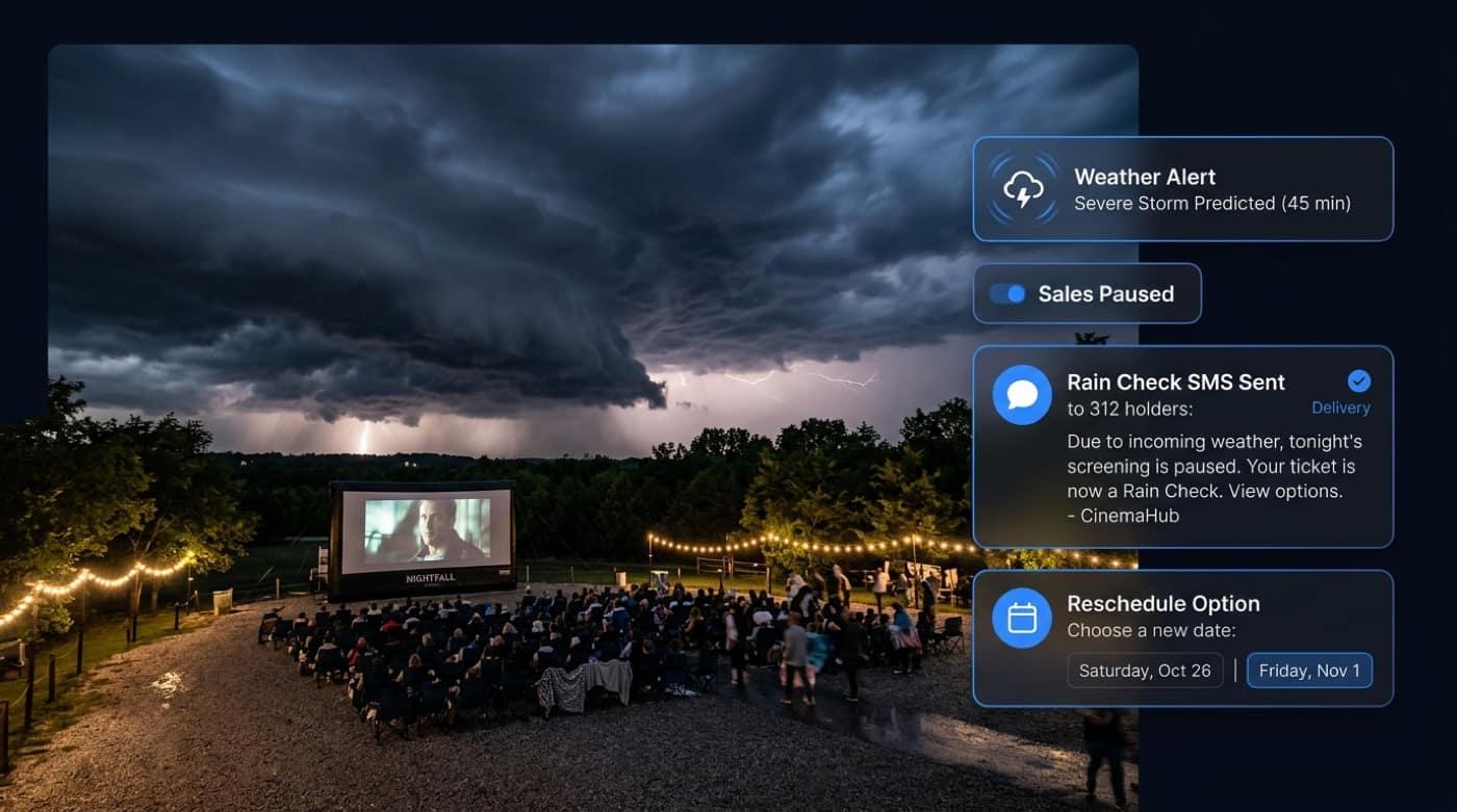 Pause sales, offer credit for next show, or auto-reschedule. Fully traceable.