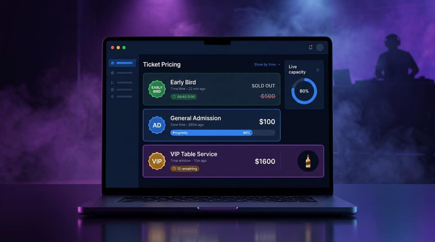 Hard caps for floor, VIP, and backstage. Sales stop when the ceiling hits.